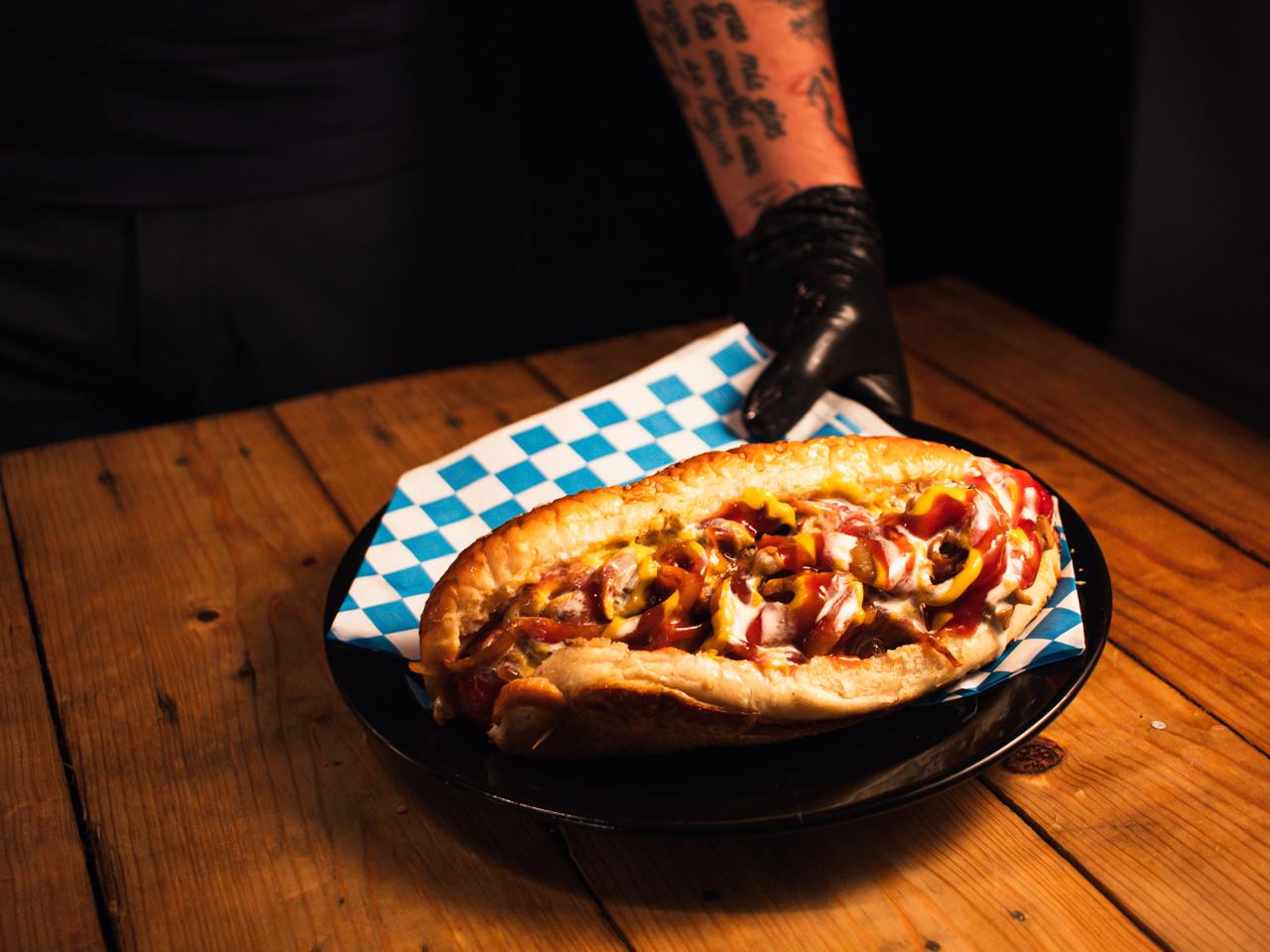 Pan artesanal, salchicha con tocino, queso Oaxaca, carne molida, mayonesa, cebolla morada, catsup, mostaza, pepinillo.