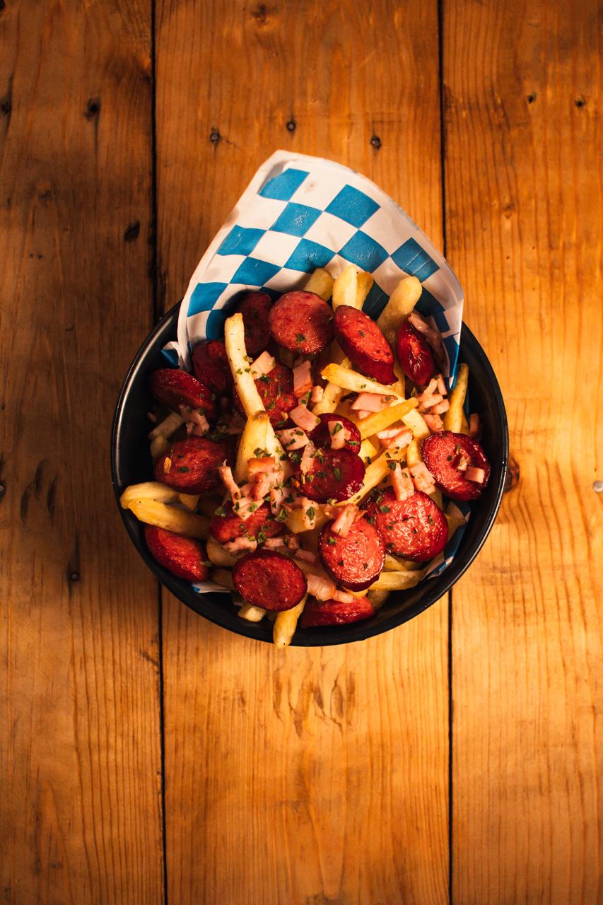 Papas a la francesa, salchicha de res, tocino, perejil picado, aderezo de la casa.