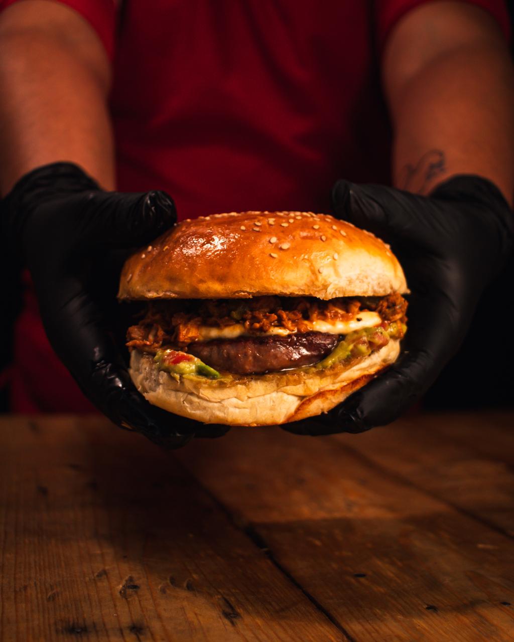 Pan, mayonesa, carne, jalapeño, queso Oaxaca, barbacoa de cerdo, guacamole.