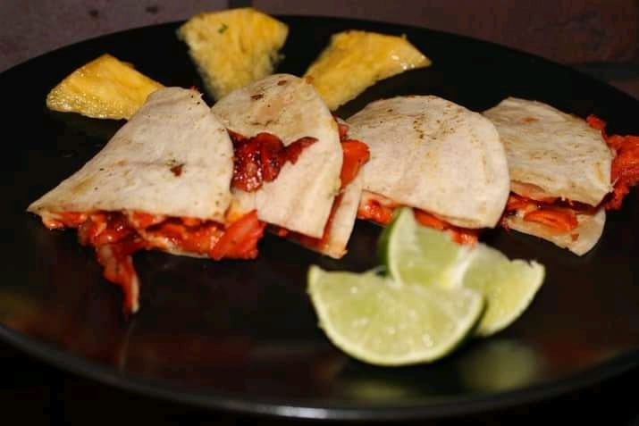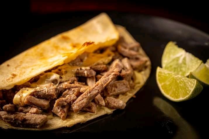 Exquisita carne al pastor, queso, dos tortillas de harina.