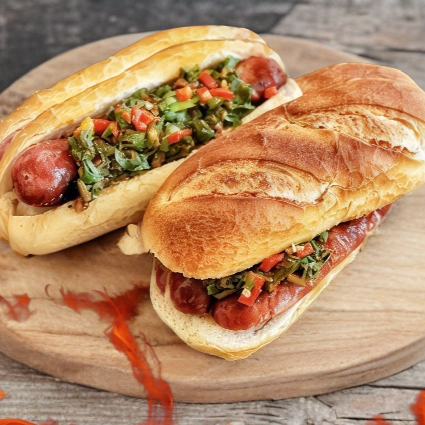 Baguette artesanal, chorizo argentino grande al carbón, ahumado y cocción lenta para un mejor sabor y crujiente, acompañado de chimichurri y cebolla caramelizada con habaneros.
