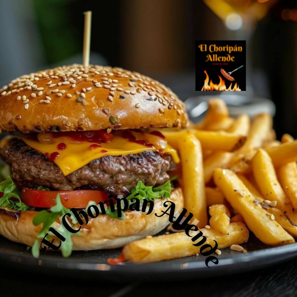 Hamburguesa de res de 200 g. Preparación especial del choripán Allende, doble queso amarillo, pepinillos en salmuera y acompañada de chiles habaneros con cebolla caramelizada.