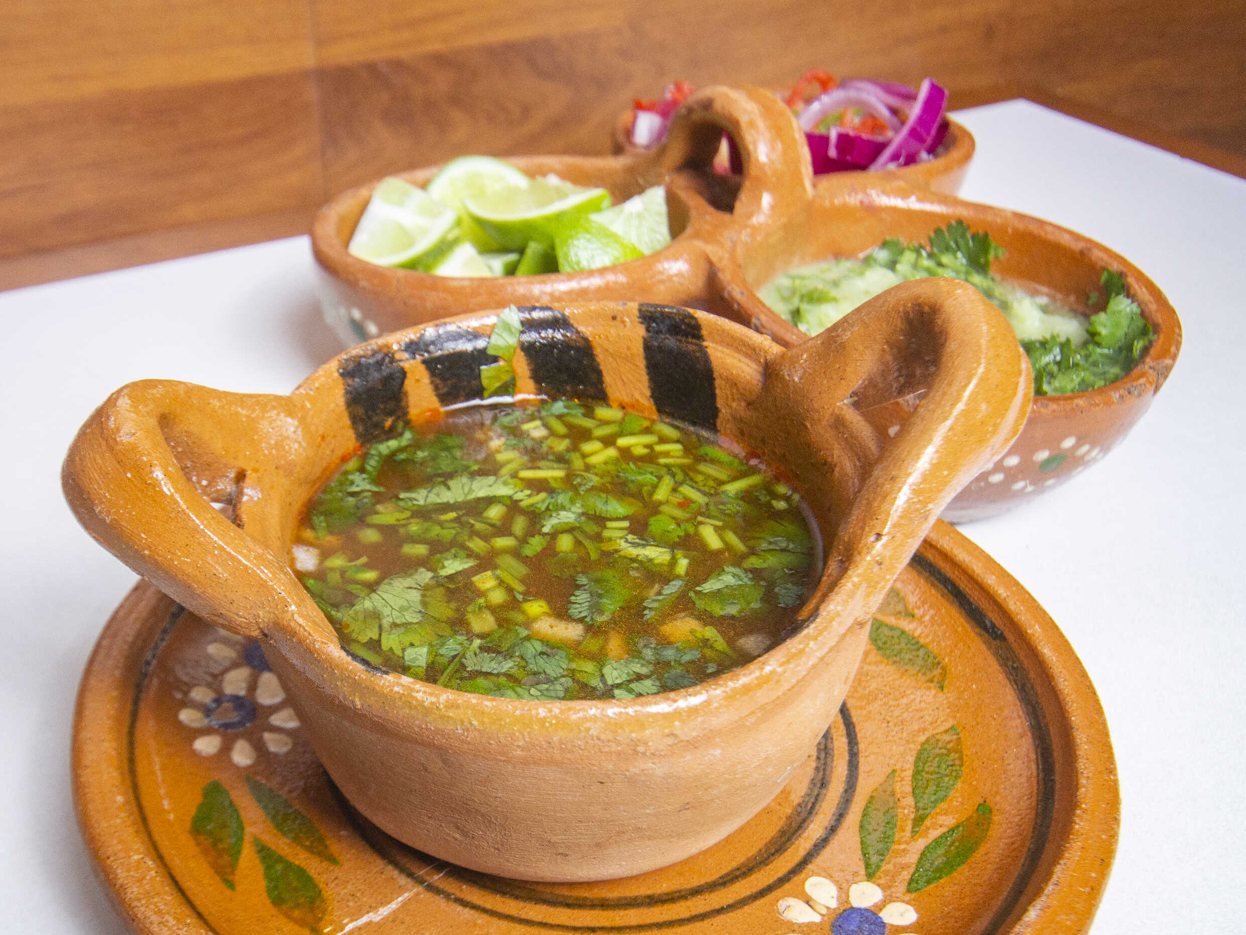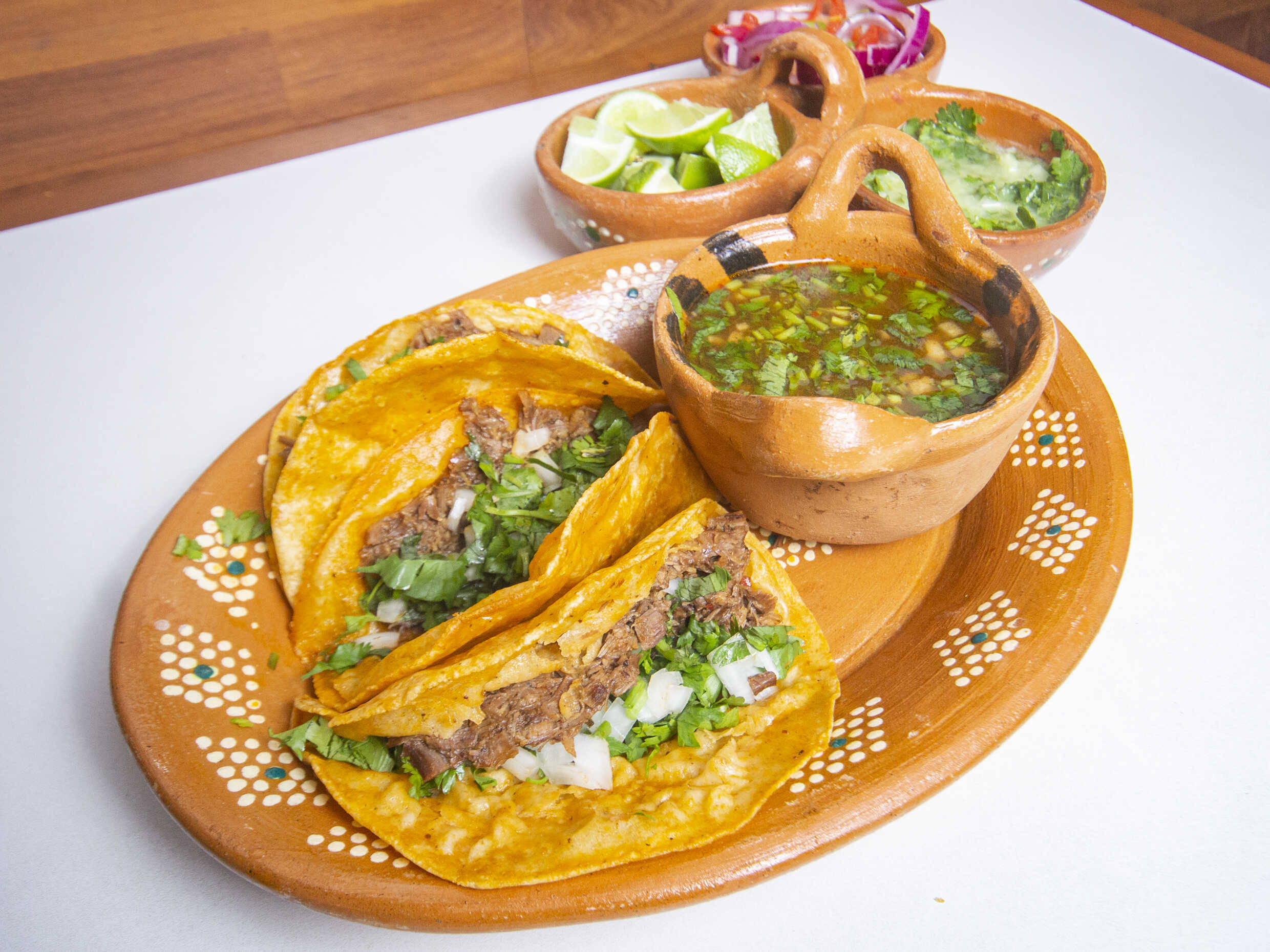 Rica cazuela de birria con carne de res, acompañada de cilantro, cebolla blanca, cebolla morada, salsa de la casa, limones y tortillas.