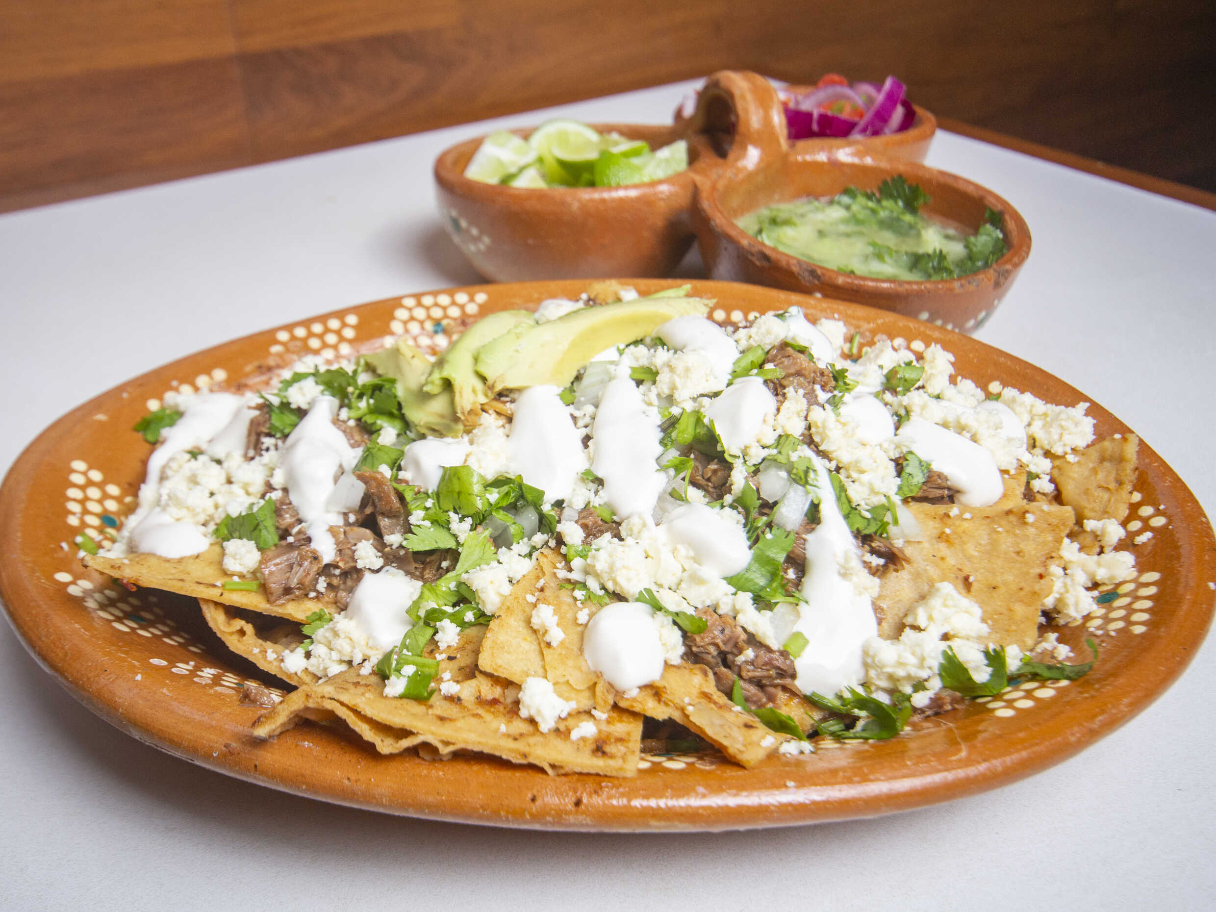 Abundante cazuela de totopos bañados en el delicioso caldo de birria. Acompañada de trozos de carne de birria, crema, queso, cebolla blanca, cebolla morada, aguacate y la particular salsa de la casa.