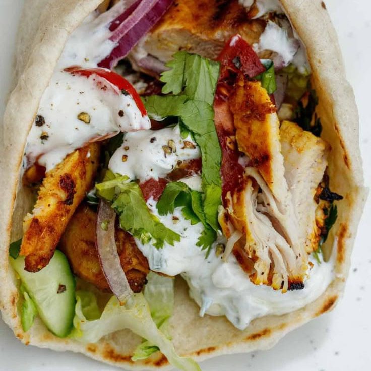 Pan, lechuga, cebolla, tomate, carne marinada con especies y masalas y salsa de ajo cobro 20 pesos para salsa extra cobro 20 pesos para carne extra
