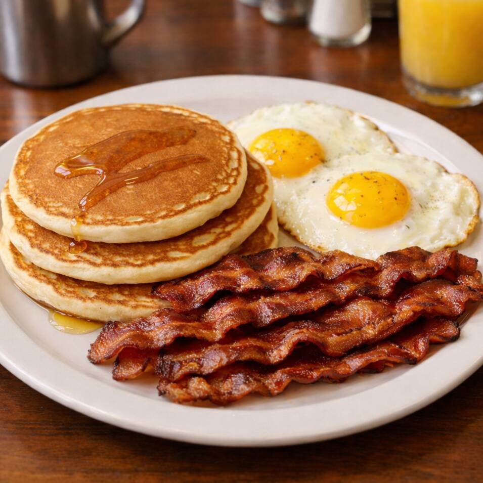 Rico desayuno a base de 3 piezas de Hot Cakes con miel; acompañados de Huevos estrellados y tocino frito.