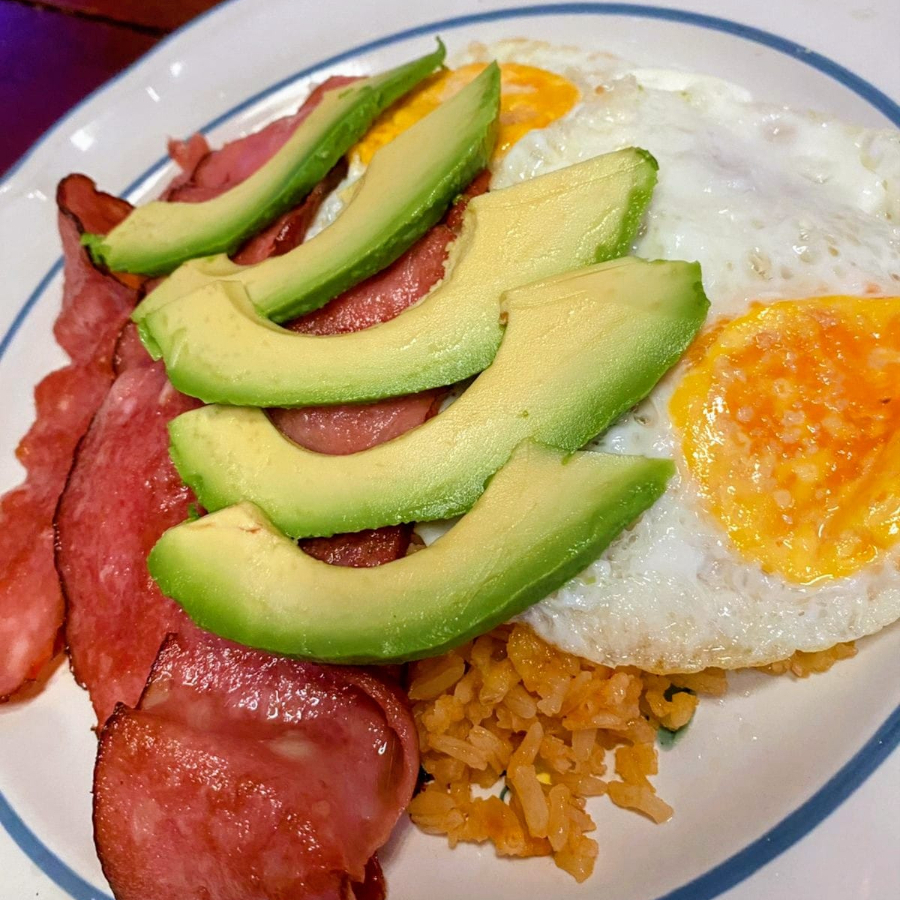 Rico desayuno a base de arroz rojo; acompañado de Huevos estrellados, Tocino y Aguacate en rodajas. Incluye 5 tortillas de Maíz hechas a mano.