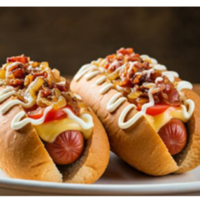 2 hot dogs de salchicha de pavo, mayonesa, tocino, cebolla caramelizada, tomate, queso oaxaca deshebrado.