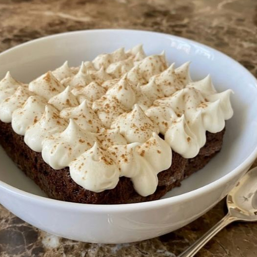 delicioso bizcocho de chocolate 3 leches con relleno de crema de chocolate y acompañado con una capa de crema batida de vainilla.