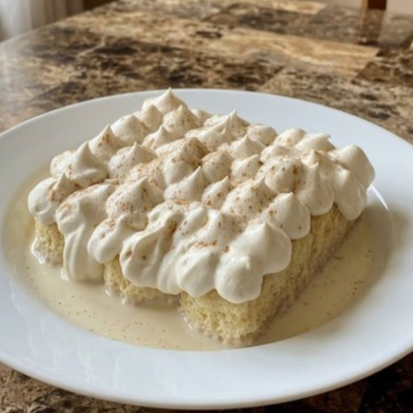 delicioso bizcocho de vainilla 3 leches con relleno de crema de fresa, acompañado de crema batida de vainilla.