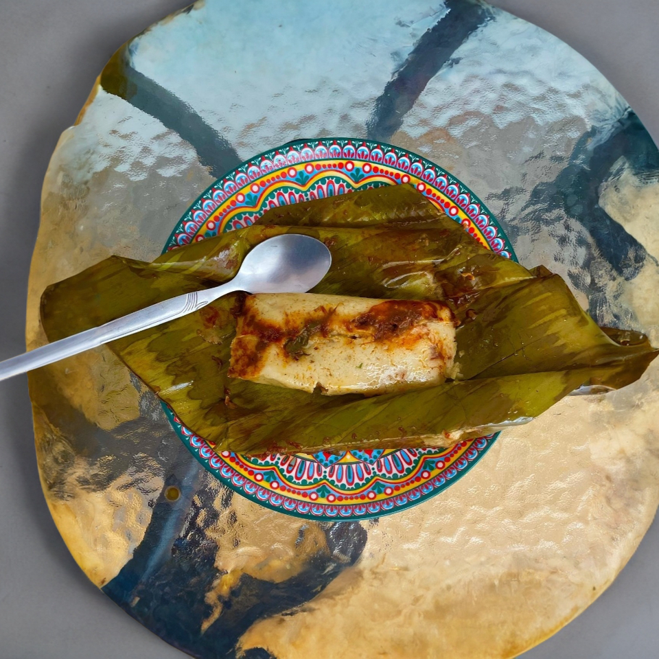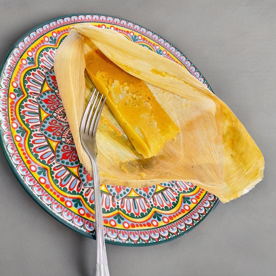 Tamal de masa con pipian de cerdo casero, envuelto en hoja de maíz.