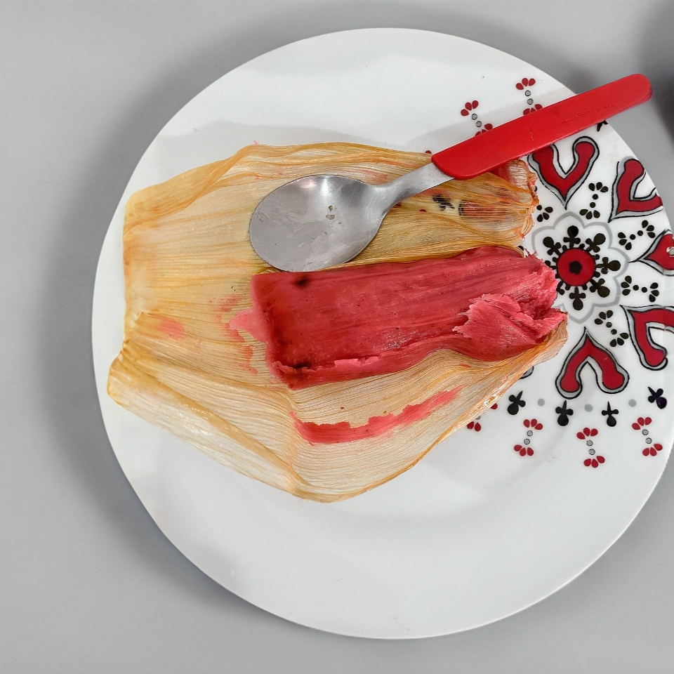 Tamal de masa dulce sabor fresa con pasas, envuelto en hoja de maíz.