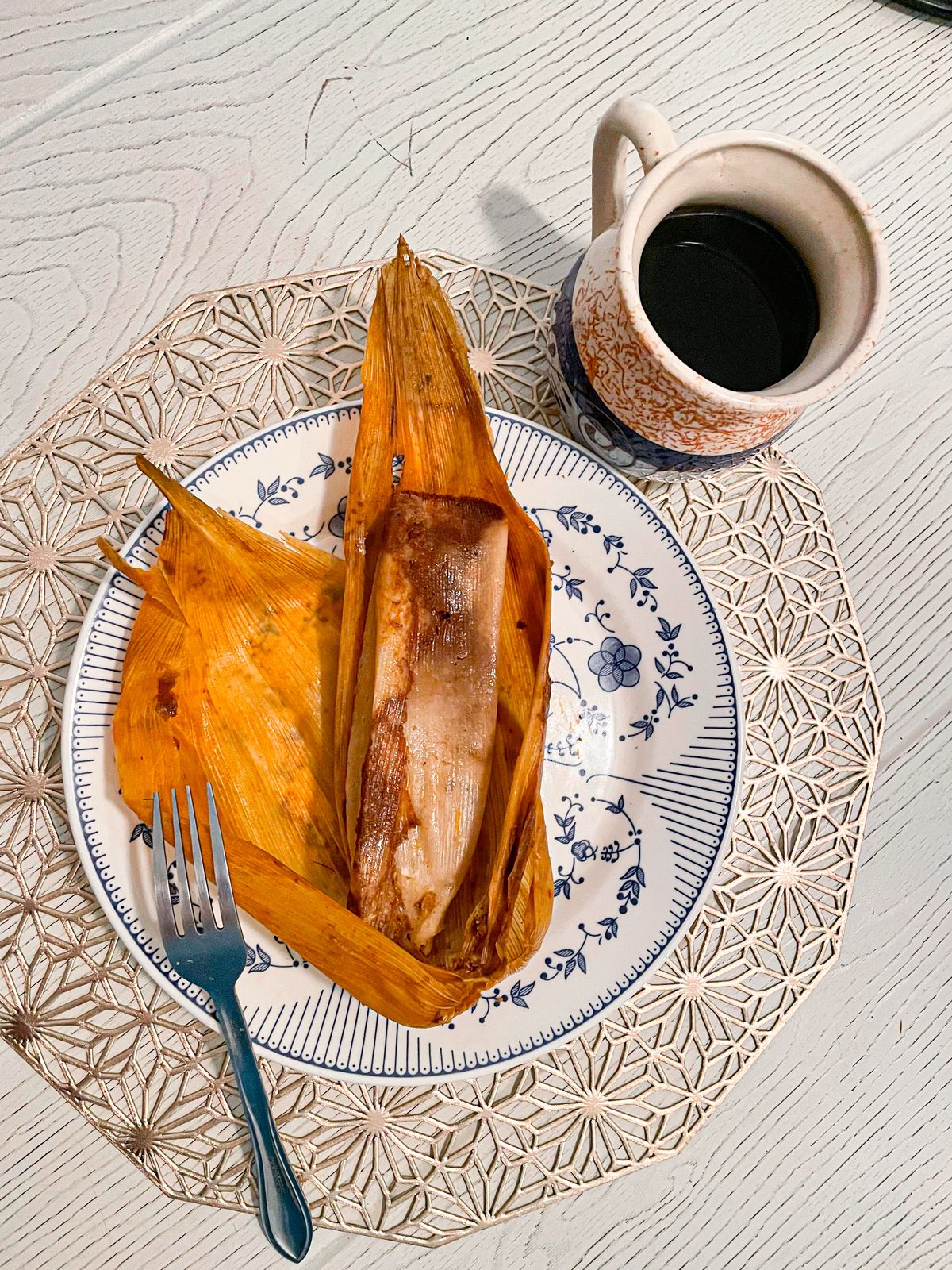 Tamal de masa con pollo y mole casero, envuelto en hoja de maíz.