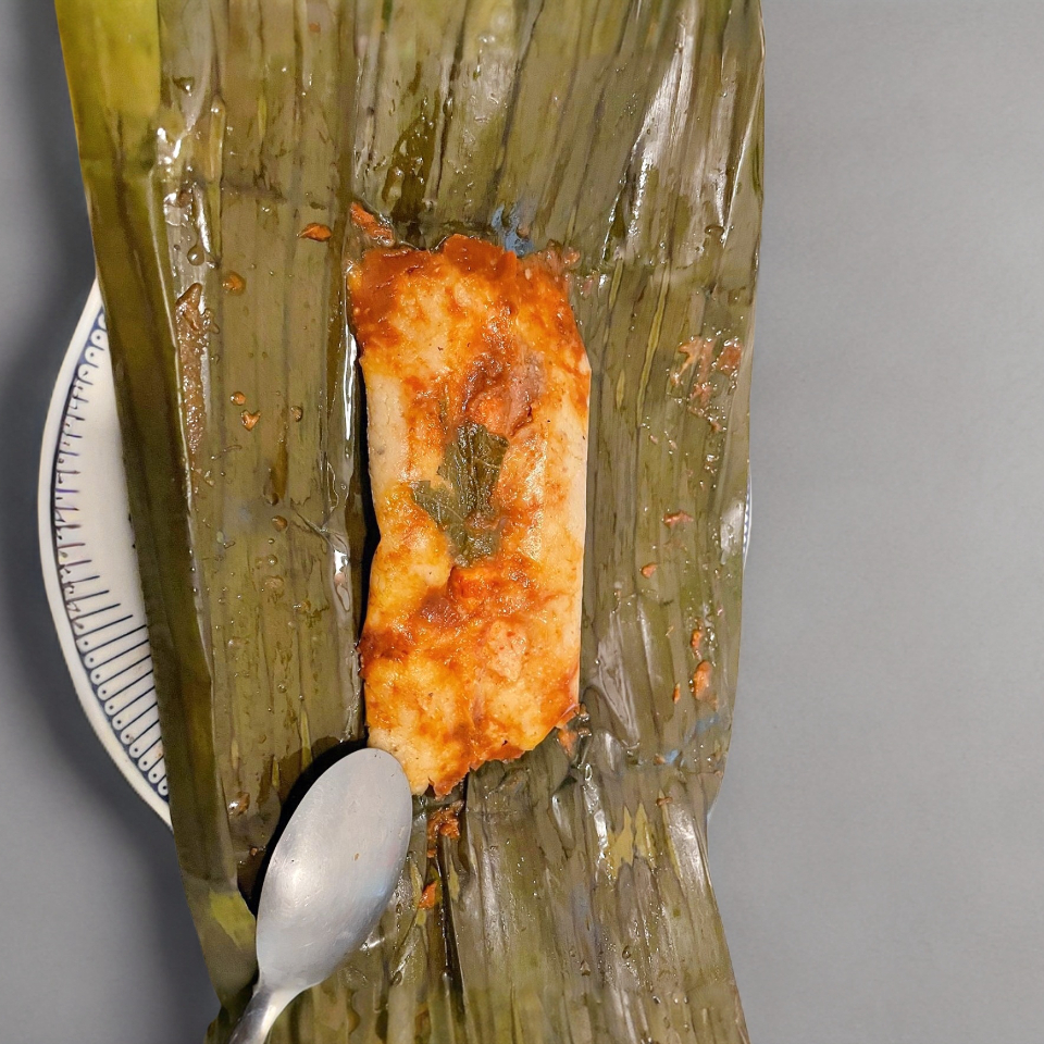 Tamal de masa de maíz con pollo en salsa roja casero, envuelto en hoja de plátano.