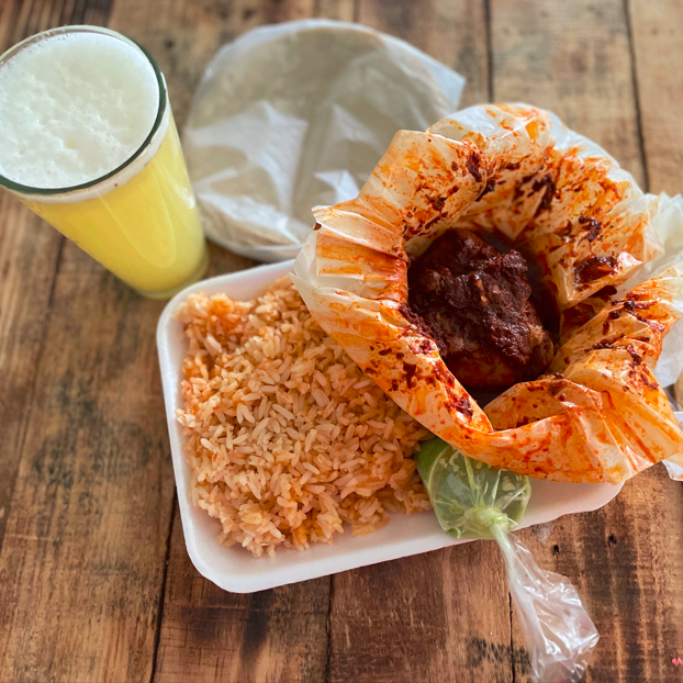 Una pieza acompañada de arroz, un agua de sabor del dia, salsa verde y tortillas