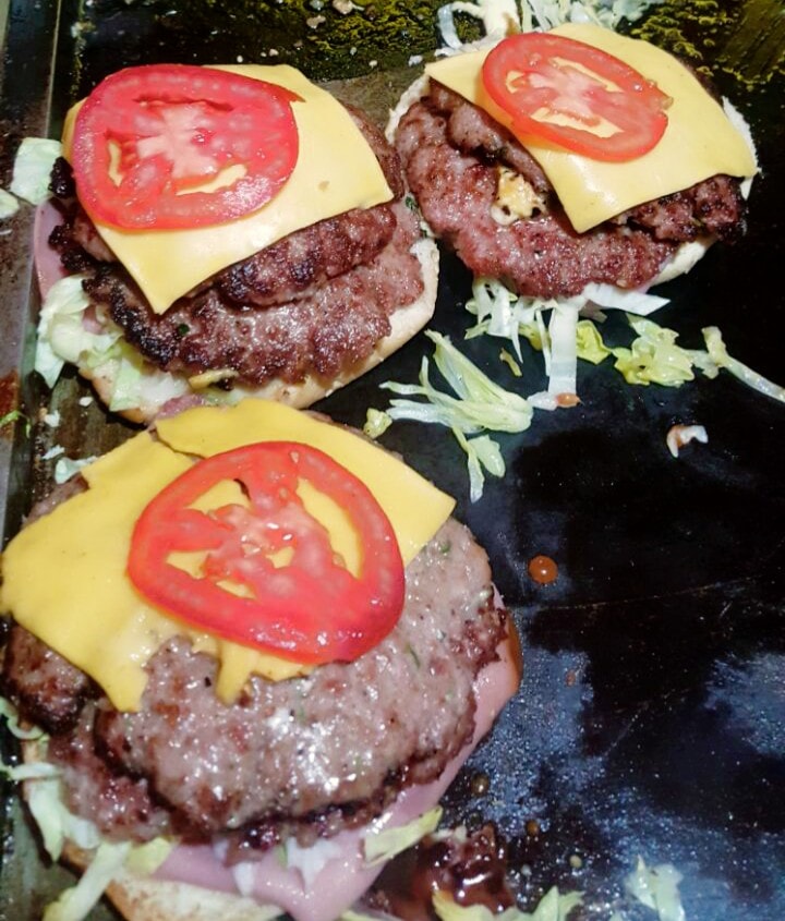 Queso amarillo, tocino, piña, queso hebra, jamón y doble carne.
