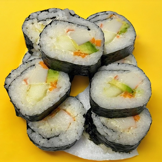Sushi de alga con arroz, surimi, zanahoria, pepino, aguacate