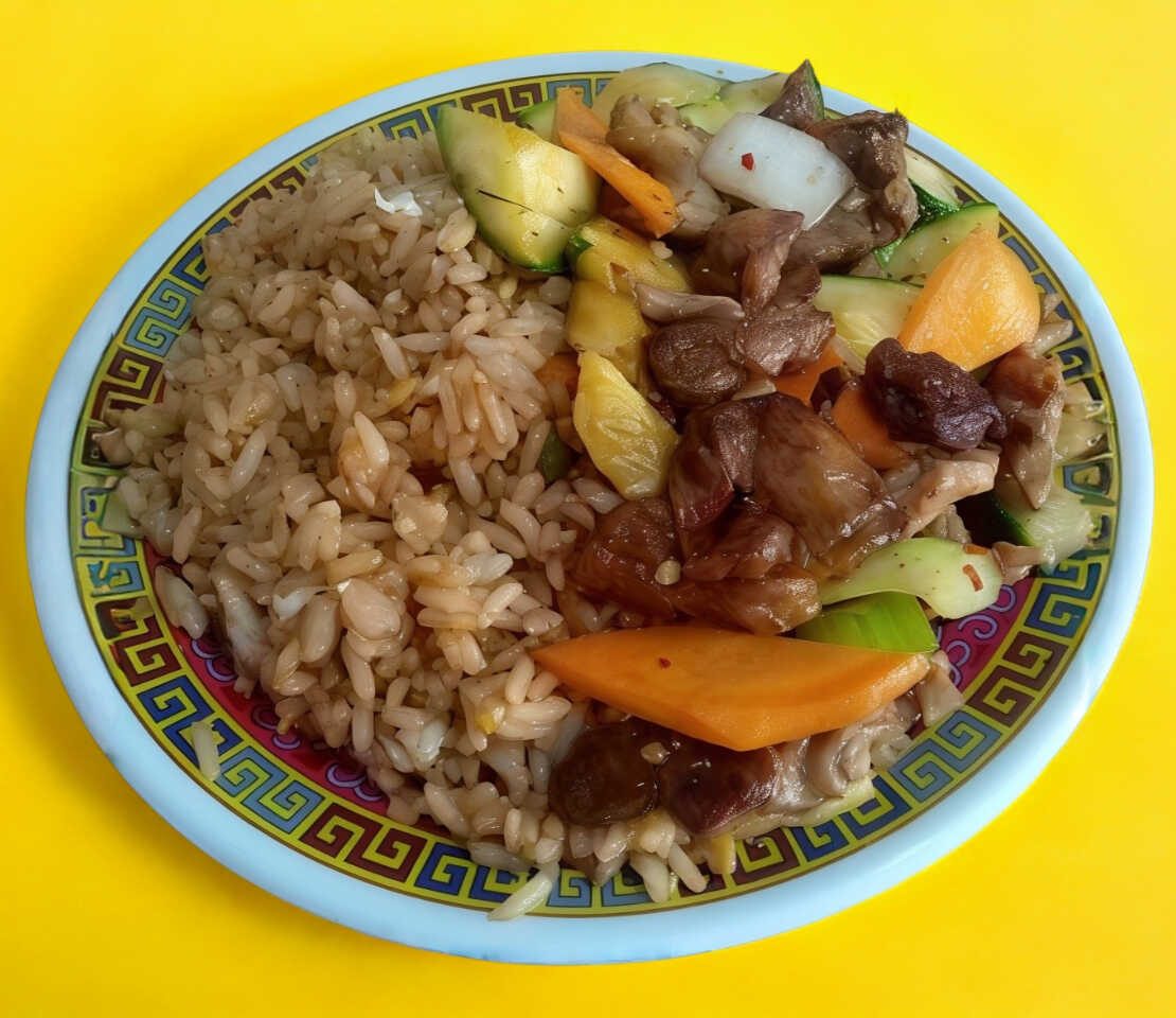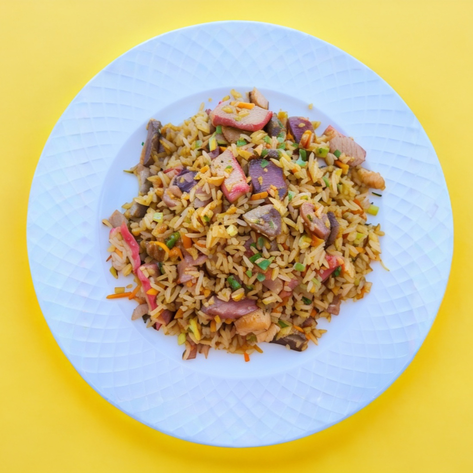 1 litro de arroz frito con carne de res, camarón, pollo, huevo y verduras