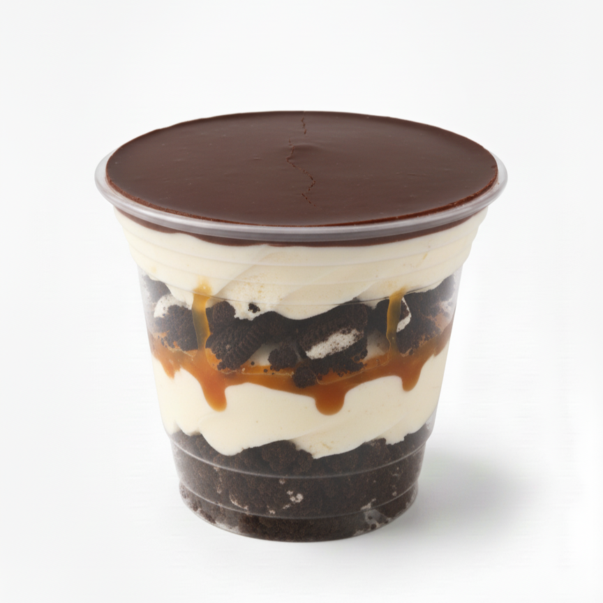 Pastel de helado frío en versión Lotus, brownie o triple chocolate, con capas dulces y cremosas de helado de vainilla, chocolate o mixto, (vasos de 10 oz).
