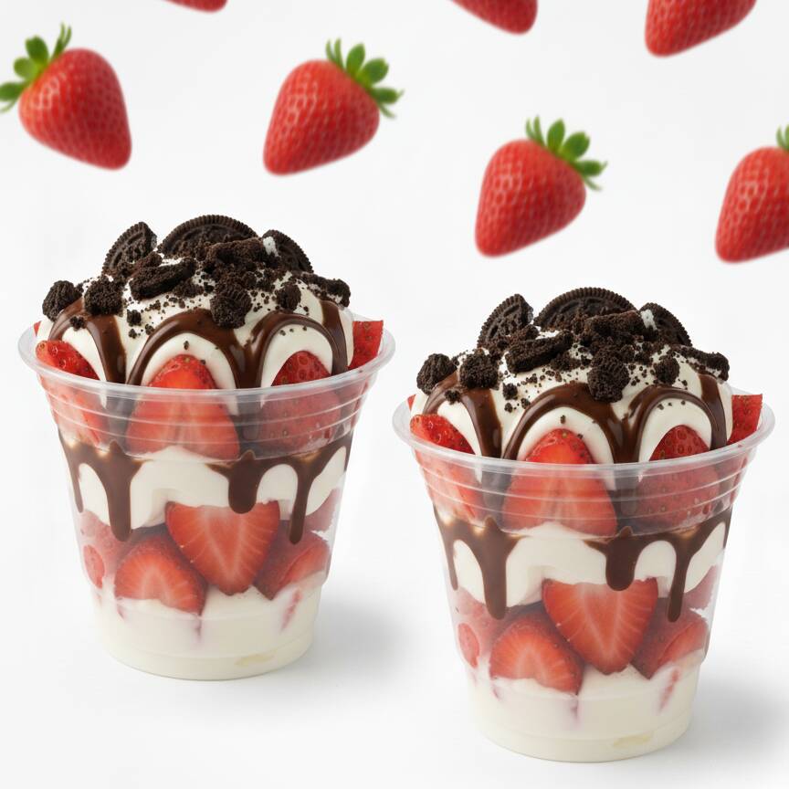 2 fresas grandes de 14 onzas, con toppings y crema dulce batida.