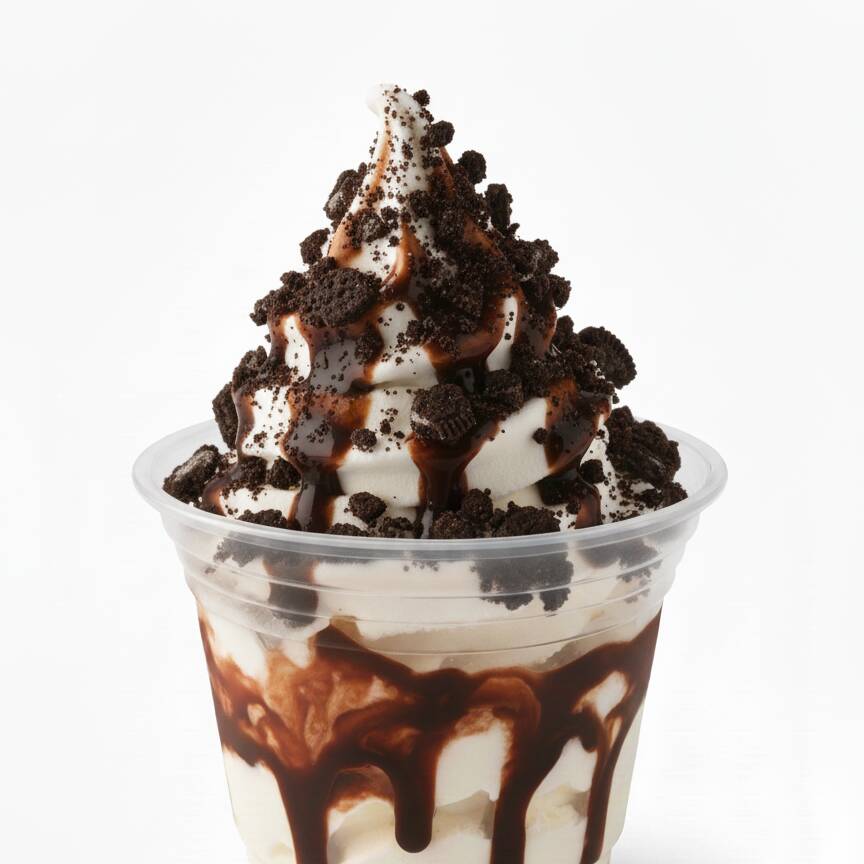 Helado cremoso de vainilla, chocolate o combinado con tu elección de toppings, ideal para combinar sabores y texturas, (vaso de 10 oz).