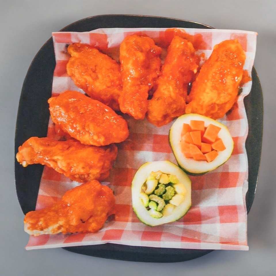 Orden de boneless (8 piezas) hecho de pechuga de pollo, bañados en una salsa a elegir y acompañados con bastones de zanahoria y aderezo.