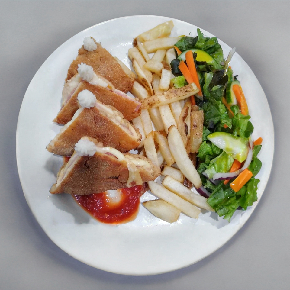 Pechuga empanizada rellena de jamón y queso manchego, acompañada de papas y ensalada.