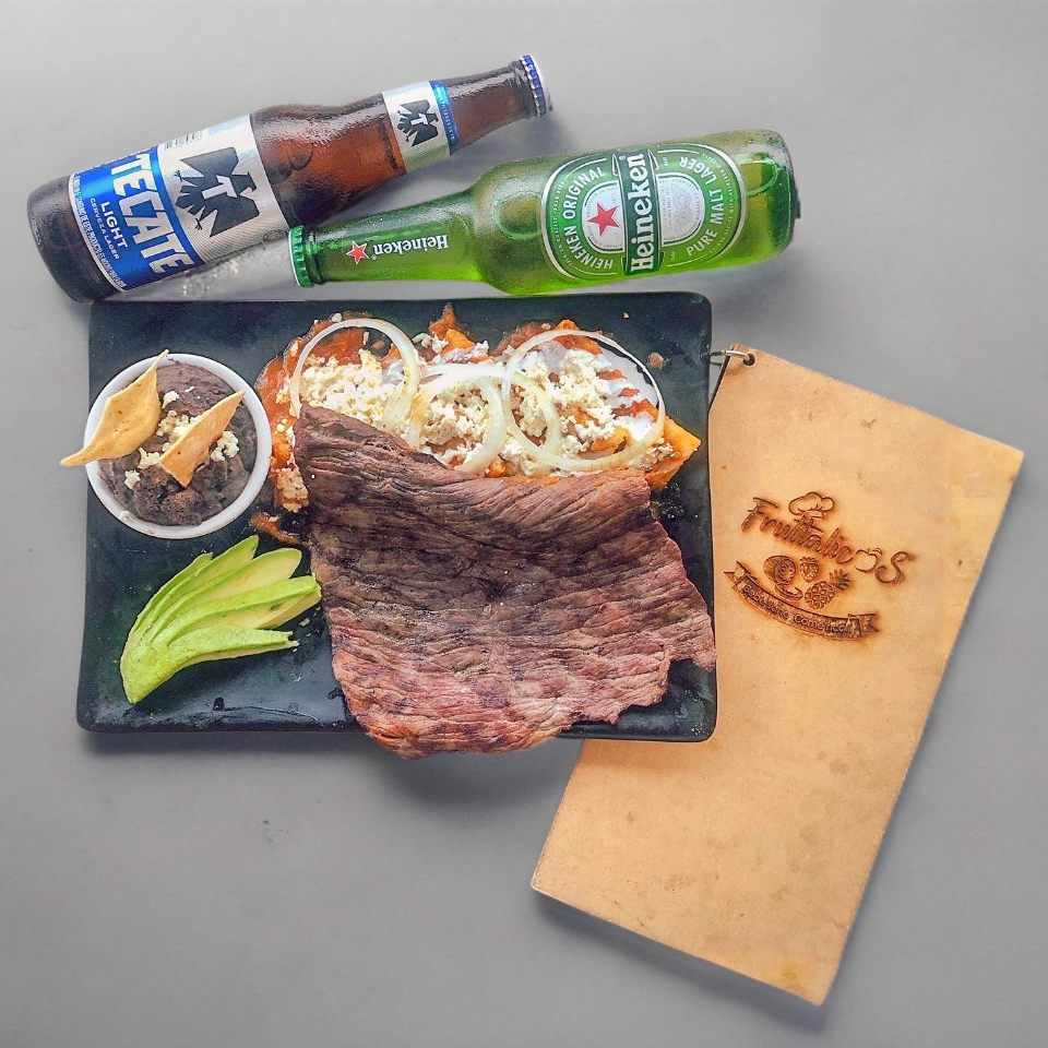 Patillo consistente en tortillas de maíz cortadas, fritas y cocinadas en salsa, acompañado con 200 gr de arrachera de res, 100 gr de fruta y 200 ml de jugo de naranja.