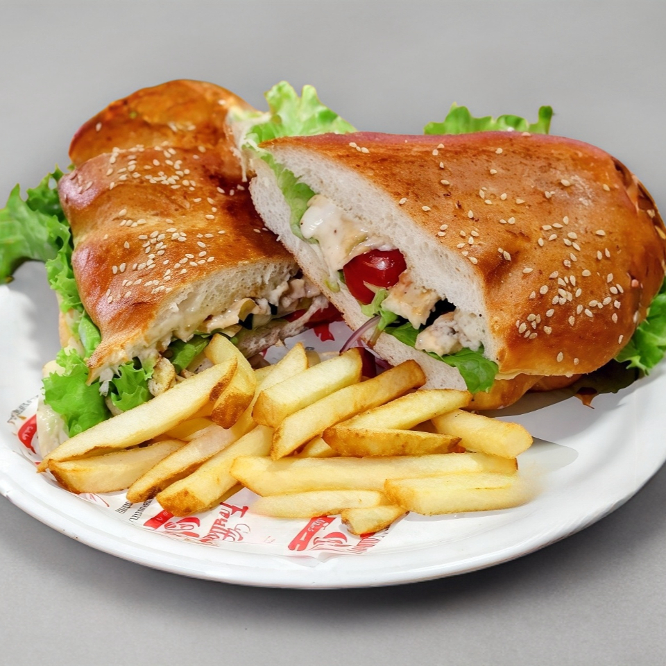 Pan estilo frances, preparado con lechuga rizada, tomate,cebolla,aguacate,pepino en rodajas,proteína a elegir, aderezo de mayonesa con chipotle y mayonesa, acompañado con 150 gr de papas a la francesa