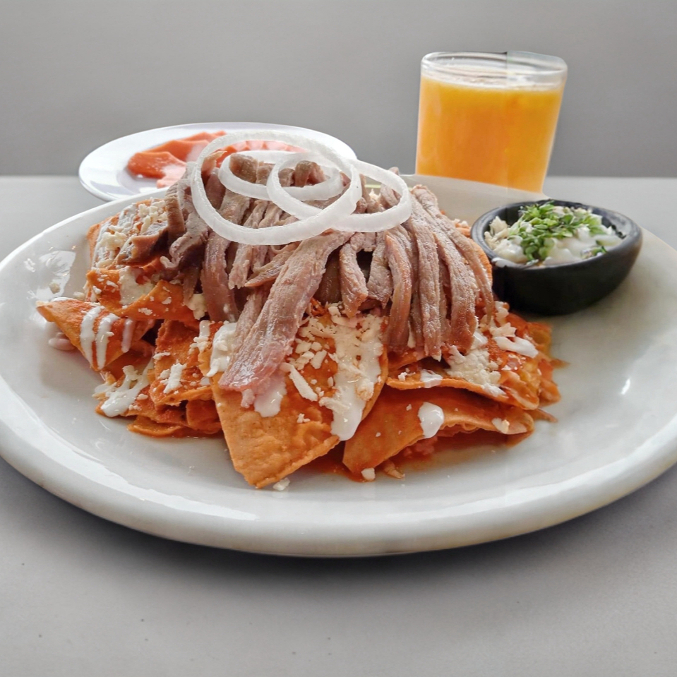 Patillo consistente en tortillas de maíz cortadas, fritas y cocinadas en salsa, acompañado con 120 gr de cecina de res, 100 gr de fruta y 200 ml de jugo de naranja.