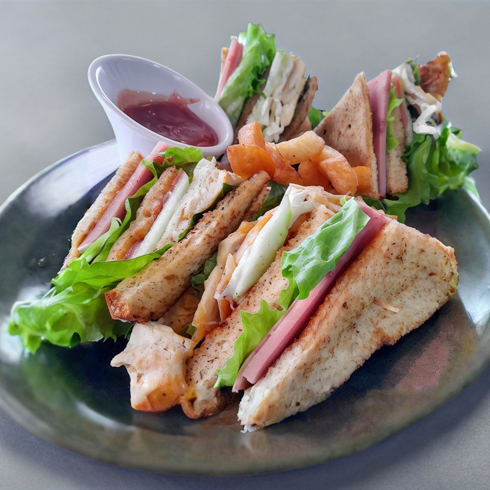 Club sándwich de jamón y queso , acompañado de papas a la francesa.