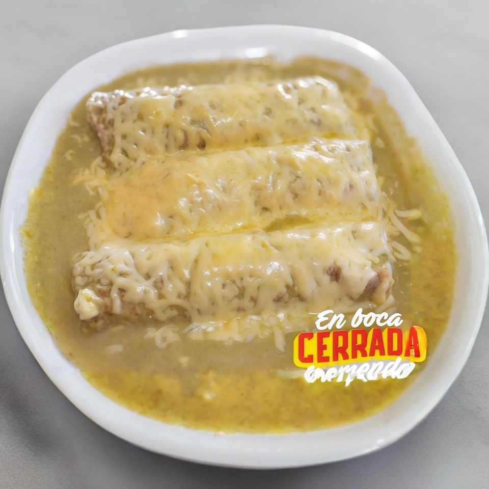 Platillo elaborado con tortillas de maíz rellenas( a elegir), bañadas con salsa verde cremosa y gratinadas con queso manchego.