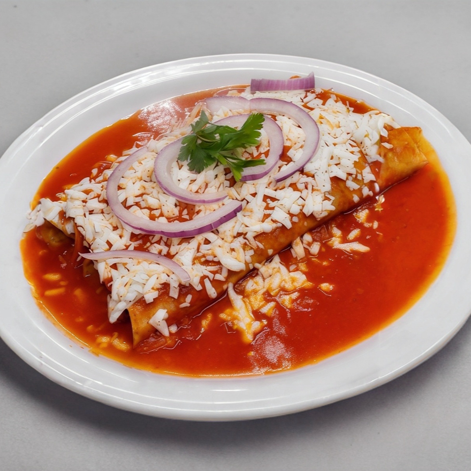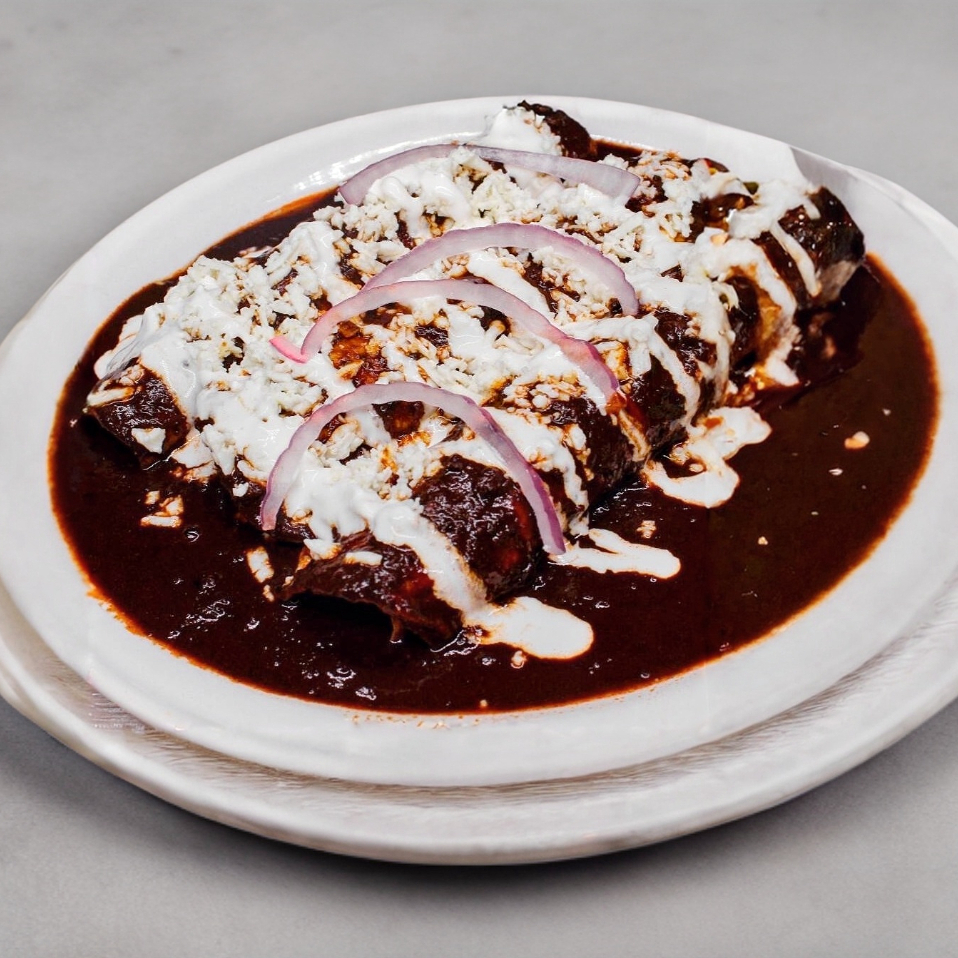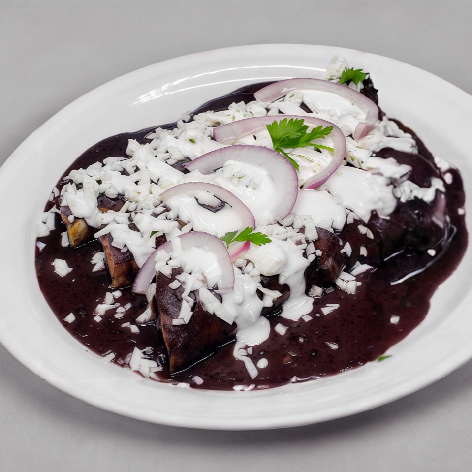Platillo elaborado con tortillas de maíz que se sumergen en un caldillo de moles preparado de la casa, enrolladas, se sirven en un plato, con queso, cebolla y crema.