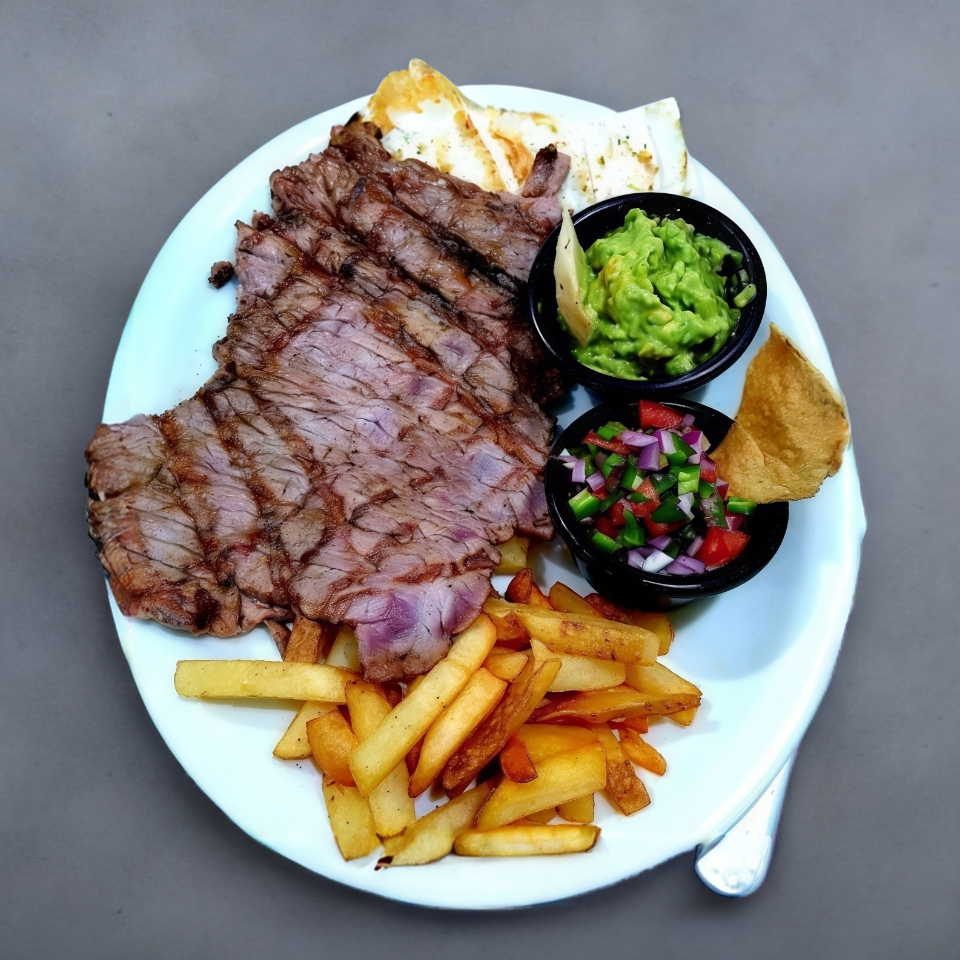 250 gr de arrachera, acompañado de guacamole,papas a la francesa, pico de gallo y triangulo de quesadillas de harina