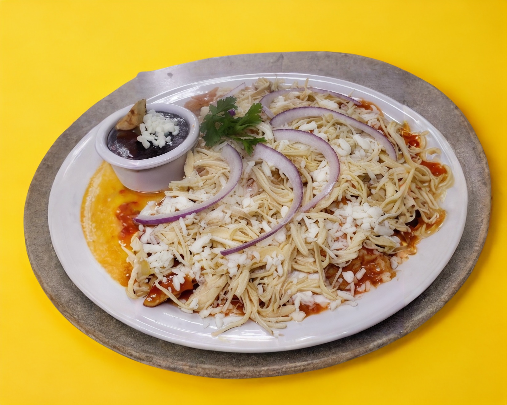 Platillo con tortillas de maíz cortadas en triangulo, fritas y salsa (a elegir); en la que se sumergen las tortillas para que se empapen,se decoran con cebolla, crema y queso