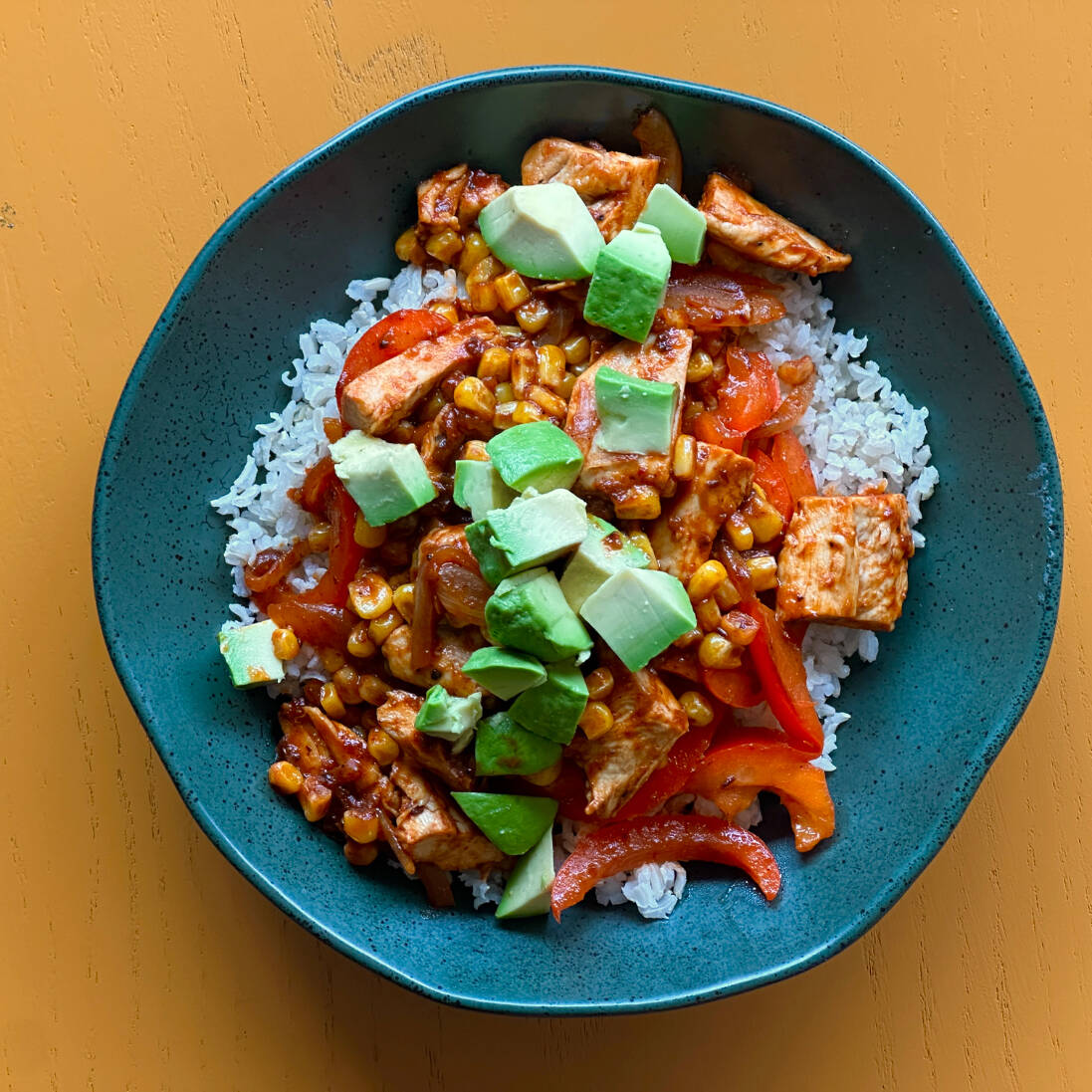 Arroz integral, pimientos, elote amarillo, cebolla, chipotle y aguacate