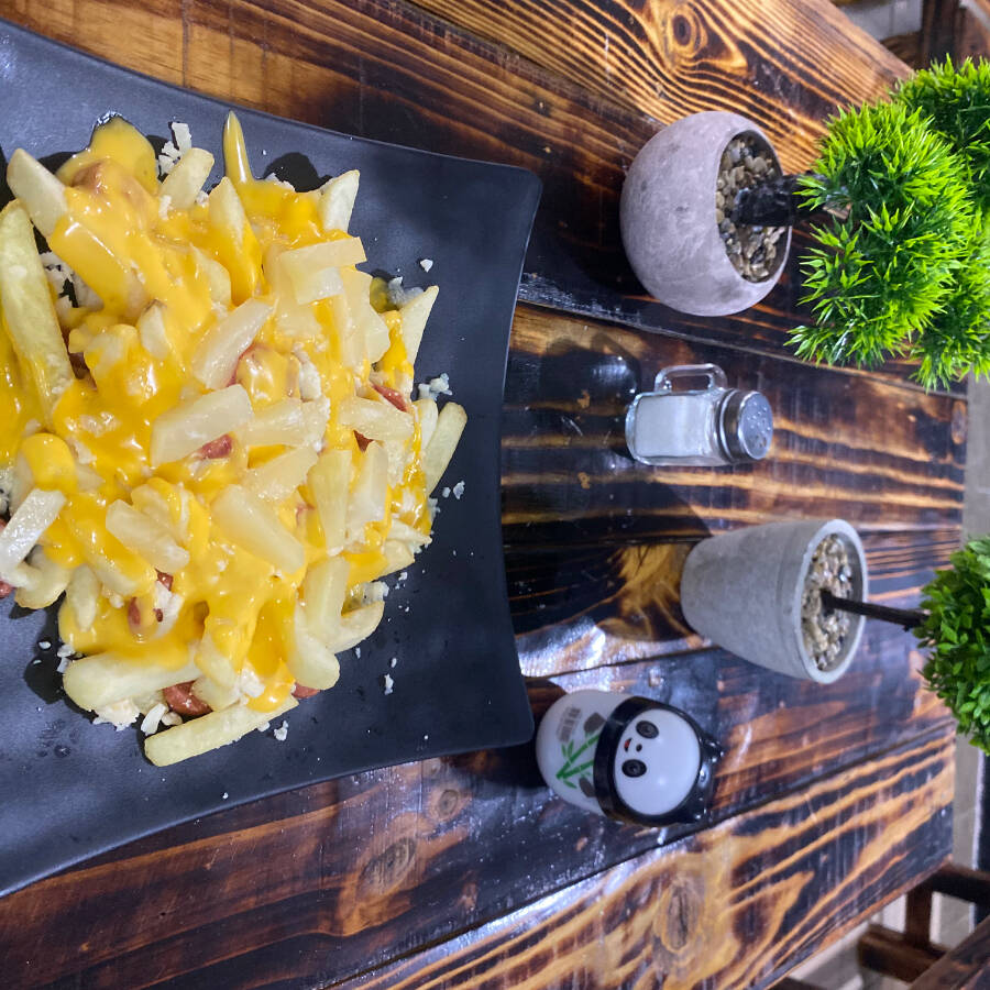200grs de papas a la francesa con salchicha, queso mozarella y queso de nacho