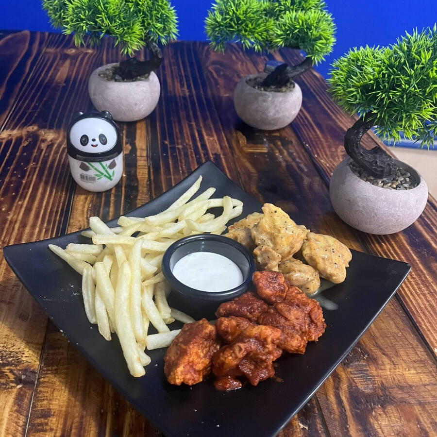 250grs de trozos de pechuga de pollo, salsa a elegir con orden de papas incluidas