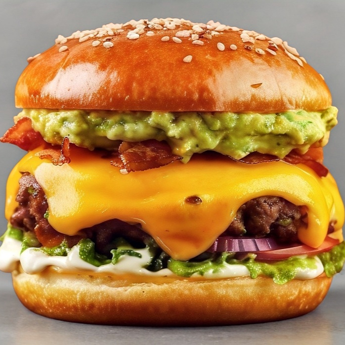 Pan ,carne(120g) queso manchego,tocino,aguacate,jitomate,cebolla,lechuga y mayonesa +papas francesas