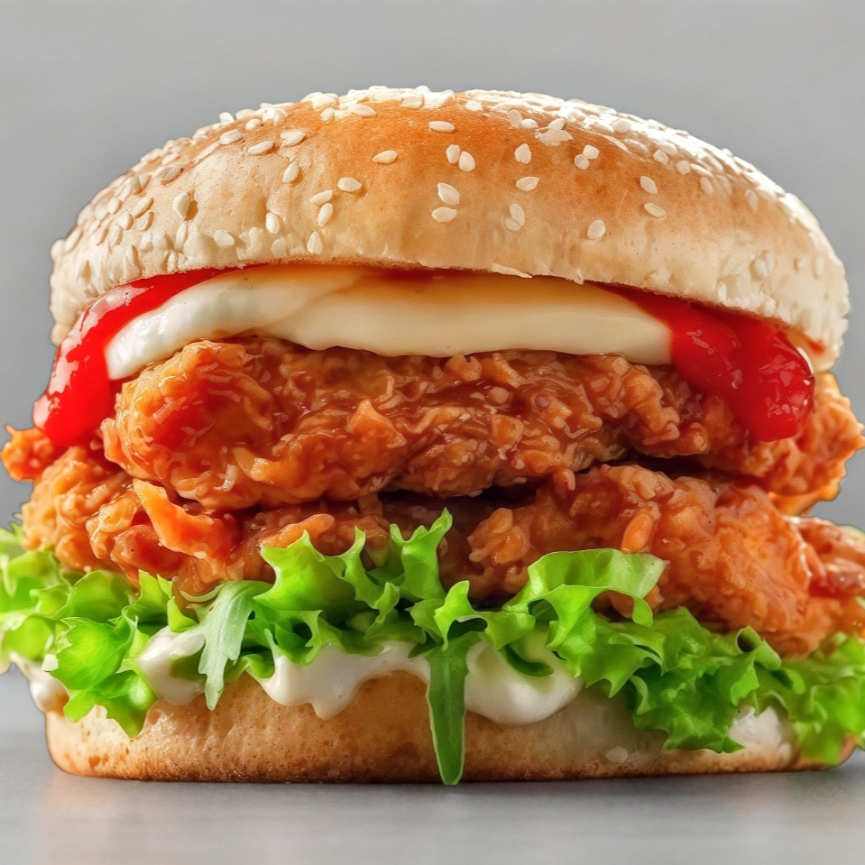 Pan,pollo empanizado (120g) bañado en salsa a elegir (BBQ, BUFALO,MANGO HABANERO) queso manchego, jitomate, cebolla, lechuga y mayonesa + papas francesas