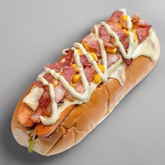 pan, mayonesa, salchicha jumbo para asar, queso Oaxaca, tocino, champiñones, jitomate, cebolla