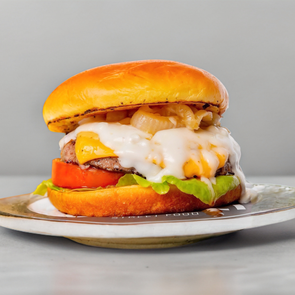 Pan,carne (120g) queso Oaxaca,queso amarillo,queso manchego,jitomate,cebolla,lechuga y mayonesa +papas francesas