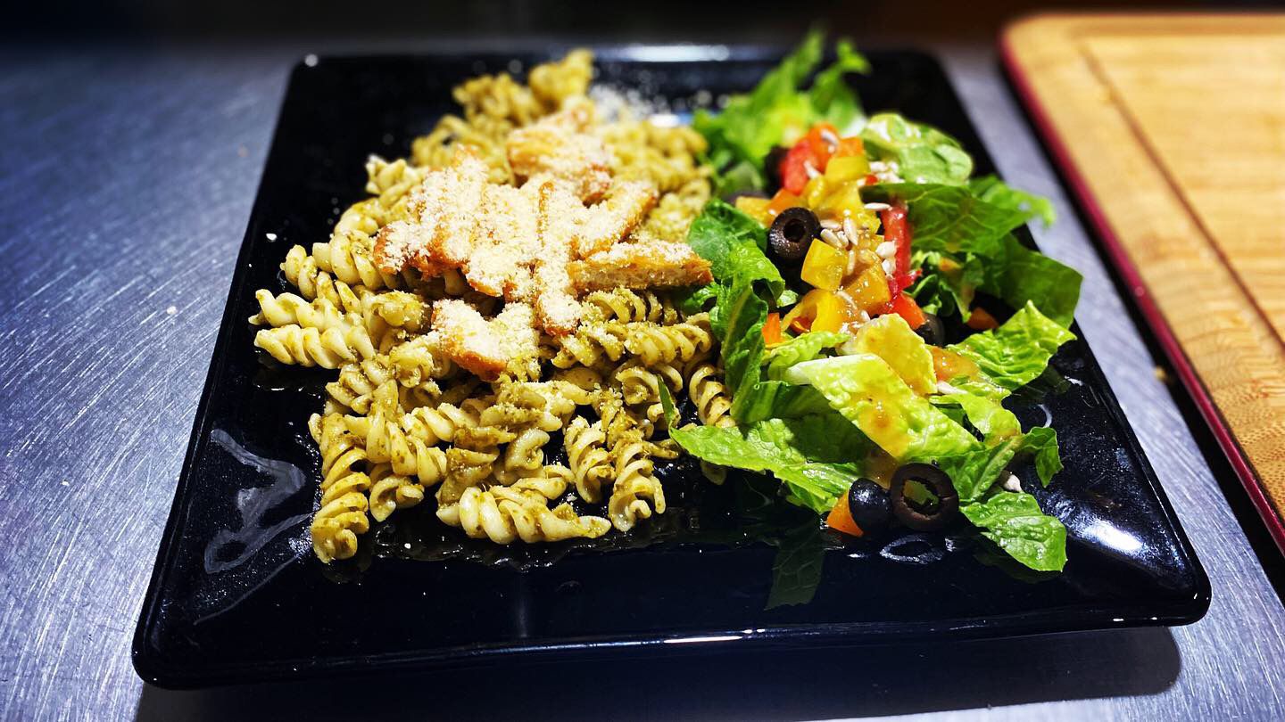 Pasta, aceituna, huevo, parmesano, pollo a la plancha (pan, Cesar, semilla)
