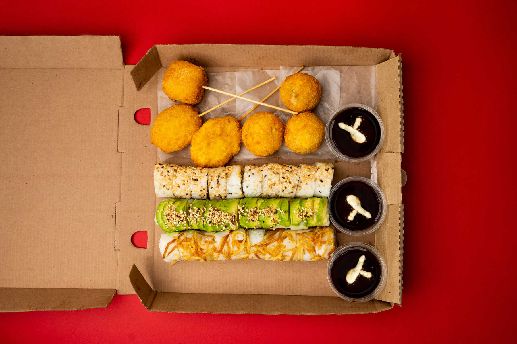 Kushiague de Queso*2 + Kushiague de Plátano*2 + Kushiague de Queso con Plátano*2 + Sushi Avocadito*1 + Bolibom*1