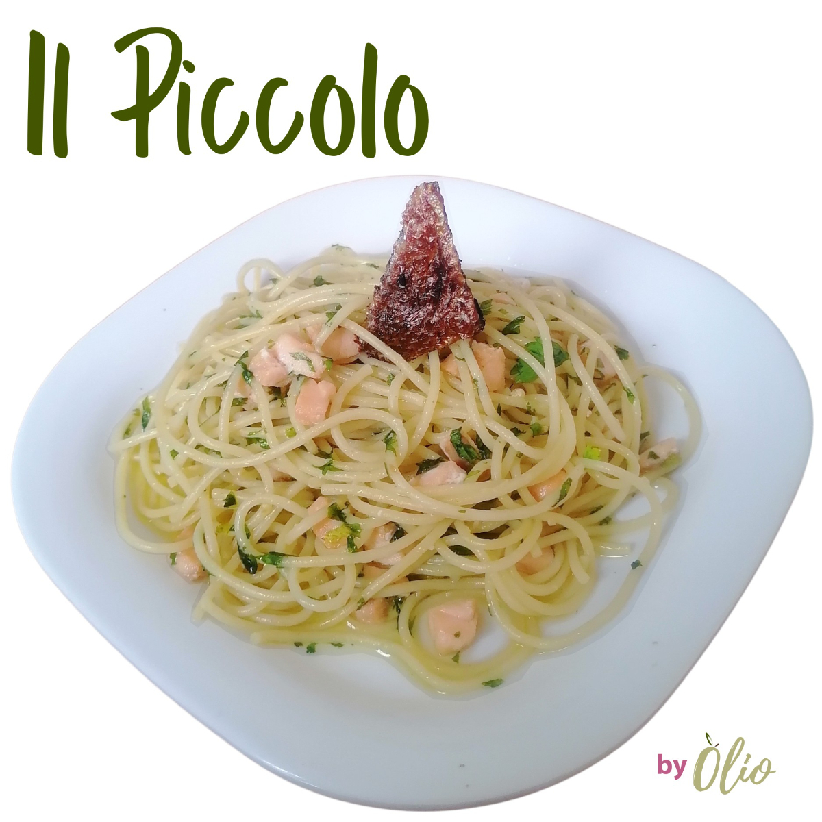 Pasta salteada en aceite de oliva, ajo y perejil con salmón (245gr).