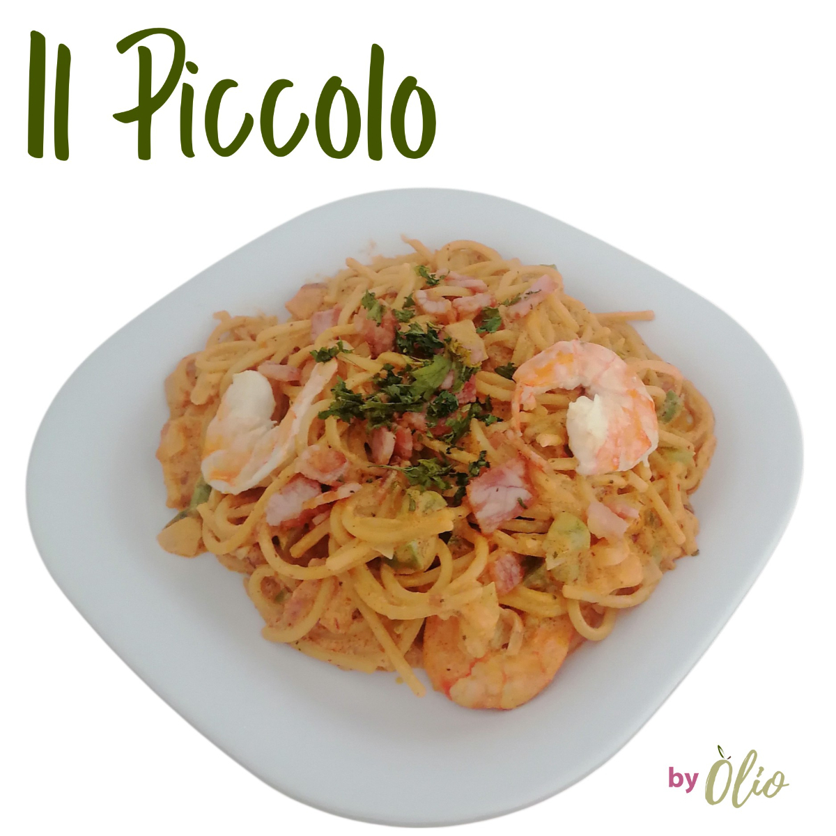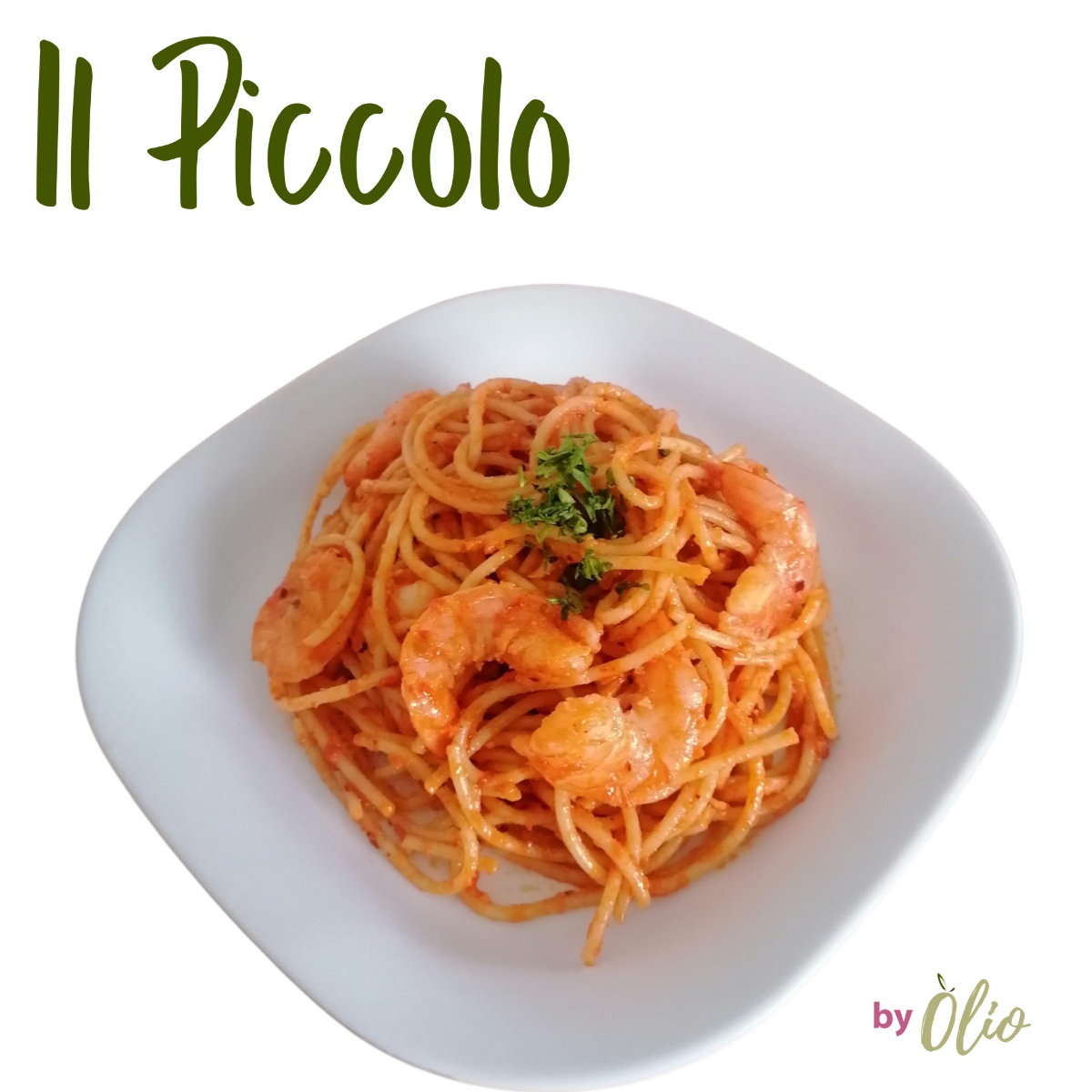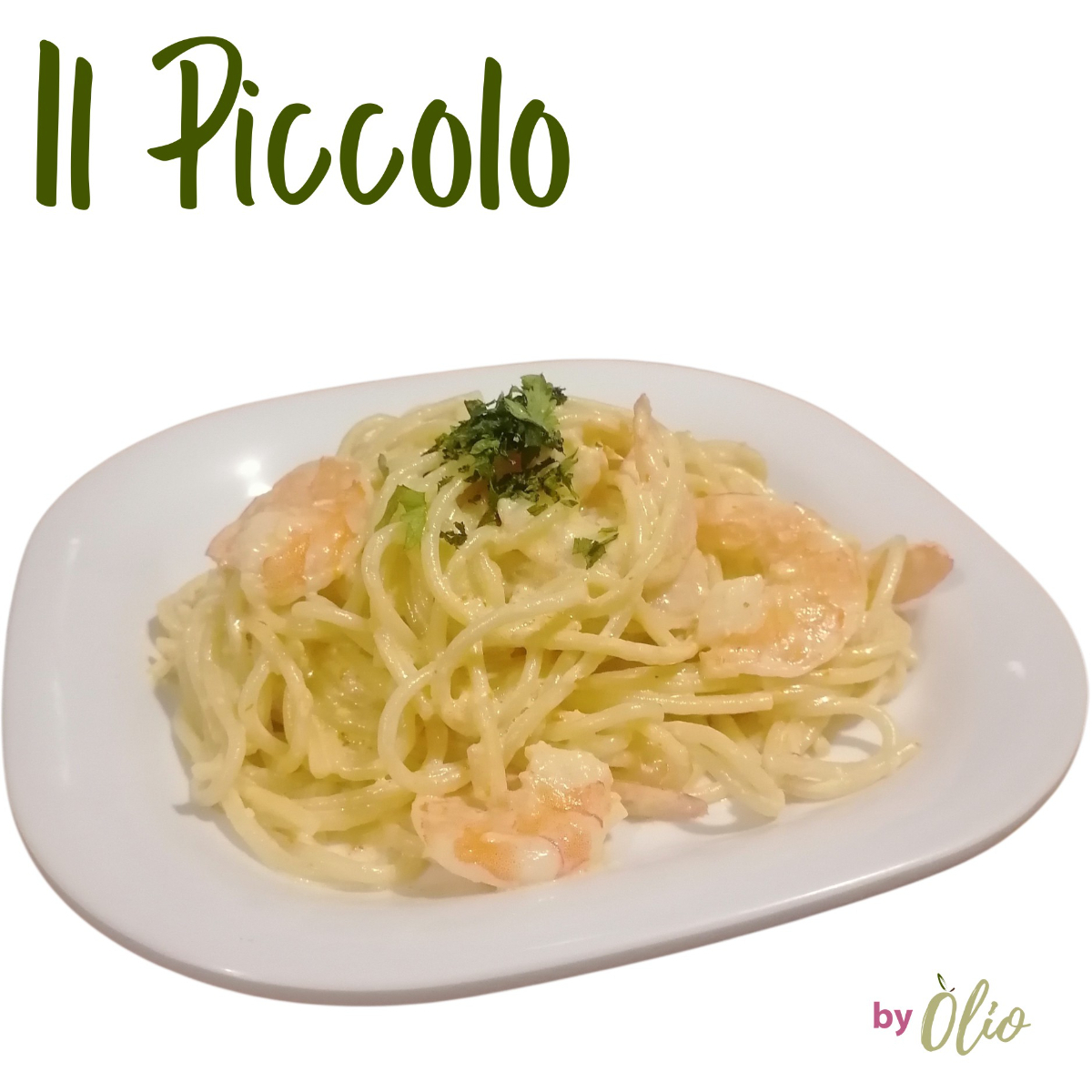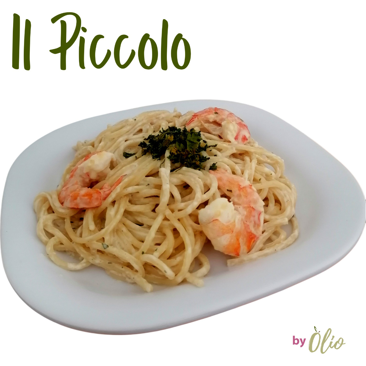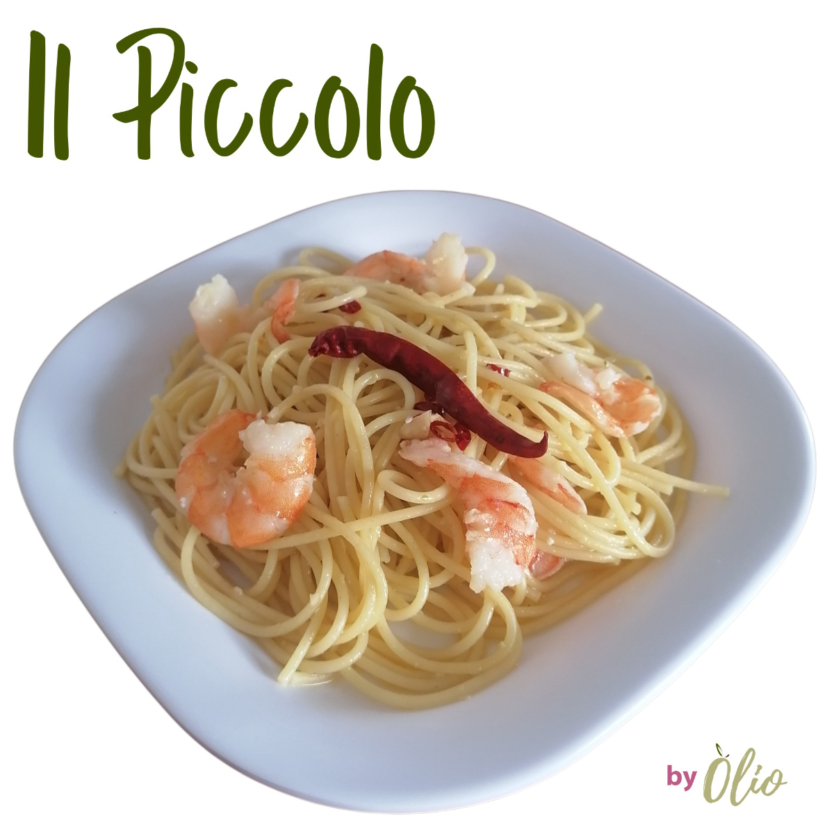 Pasta salteada en aceite de oliva, ajo, chile de árbol y camarones (220gr).