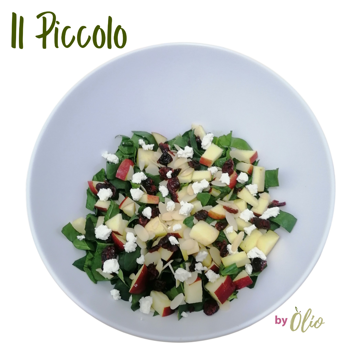 Ensalada de espinacas, manzana, arándanos deshidratados, almendras y queso de cabra.