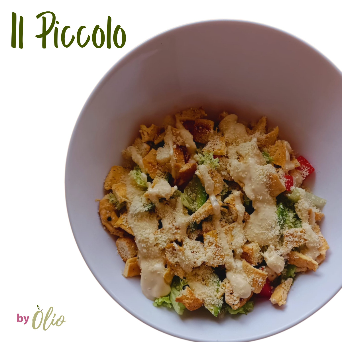 Ensalada de lechuga, jitomate, aguacate, crutones, pechuga de pollo a la plancha, queso parmesano y aderezo césar.