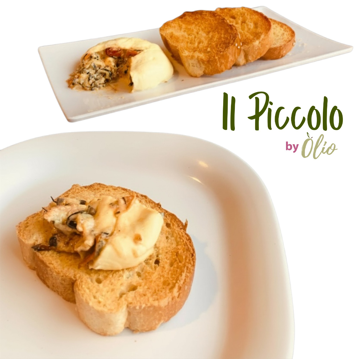 Queso burrata con relleno cremoso de tomates cherry, aceitunas negras y ajo.