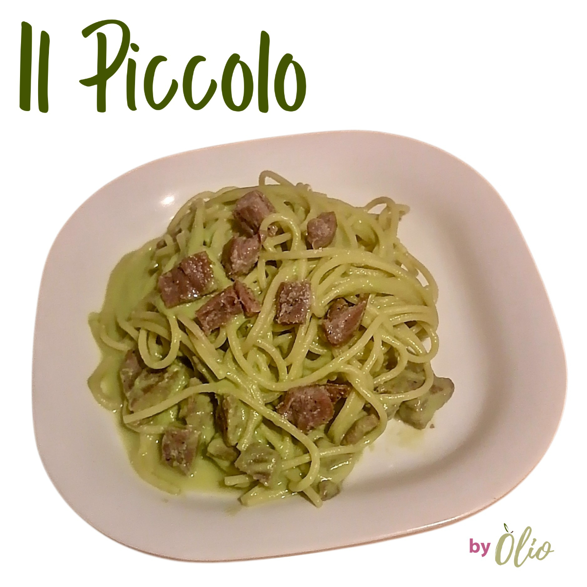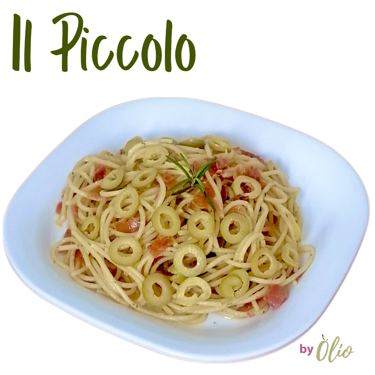 Pasta salteada en aceite de oliva, ajo y romero con jamón serrano y aceitunas verdes (220gr).